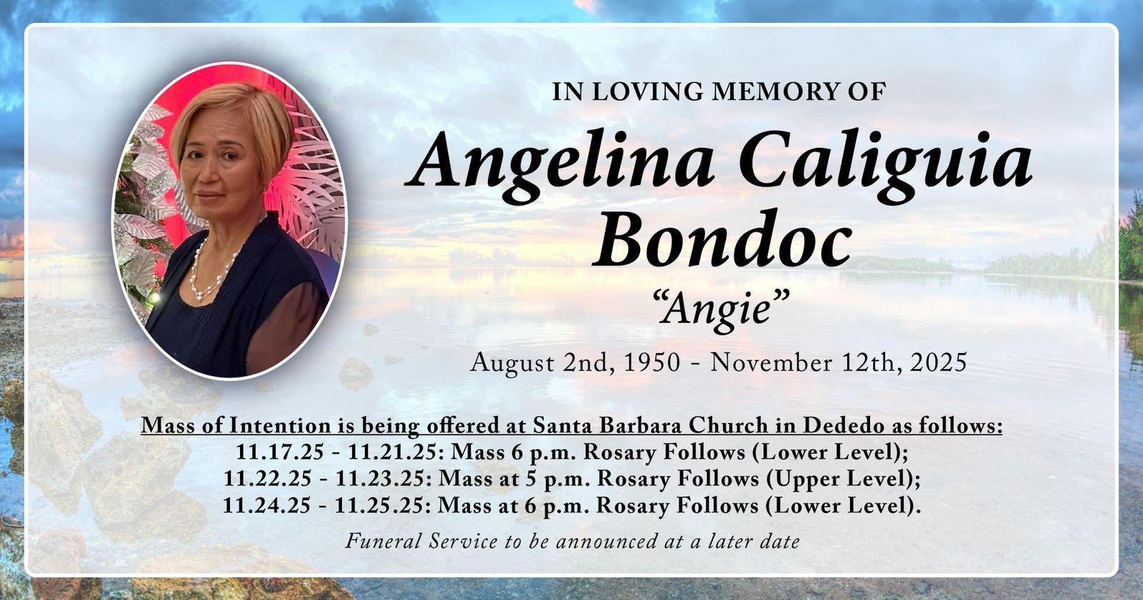 Angelina “Angie” Caliguia Bondoc, of Dededo passed away on November 12, 2025, at the age of 75. Mass followed by Rosary is being offered at Santa Barbara Church, Dededo: Weekdays Mass at 6pm/Rosary 6:30pm (lower-level), Weekends Mass at 5pm/Rosary 5:30pm (upper-level) until November 25 th . Viewing and Last Respects may be paid on Friday, December 5, 2025, from 9:00am-11:30am followed by Mass of Christian Burial at 12pm at Santa Barbara Church, Dededo (lower-level). Interment Service will immediately follow at Our Lady of Peace Memorial Gardens, Windward Hills, Yona.