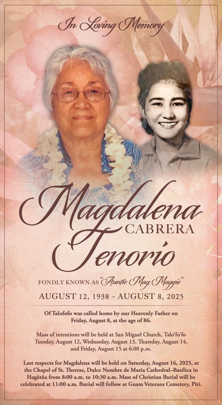 Magdalena “Maggie / Auntie Mag” Cabrera Tenorio, of Talofofo was called to eternal life on August 8, 2025, at the age of 86. Mass of Intention is being offered on Mon-Fri at 6pm at San Miguel Church, Talofofo. Viewing and Last Respects may be paid on Saturday, August 16, 2025, from 8:00am – 10:30am, followed by Mass at 11:00am at the Chapel of St. Therese, Hagatna. Interment Services will immediately follow at Guam Veterans Cemetery, Piti.
