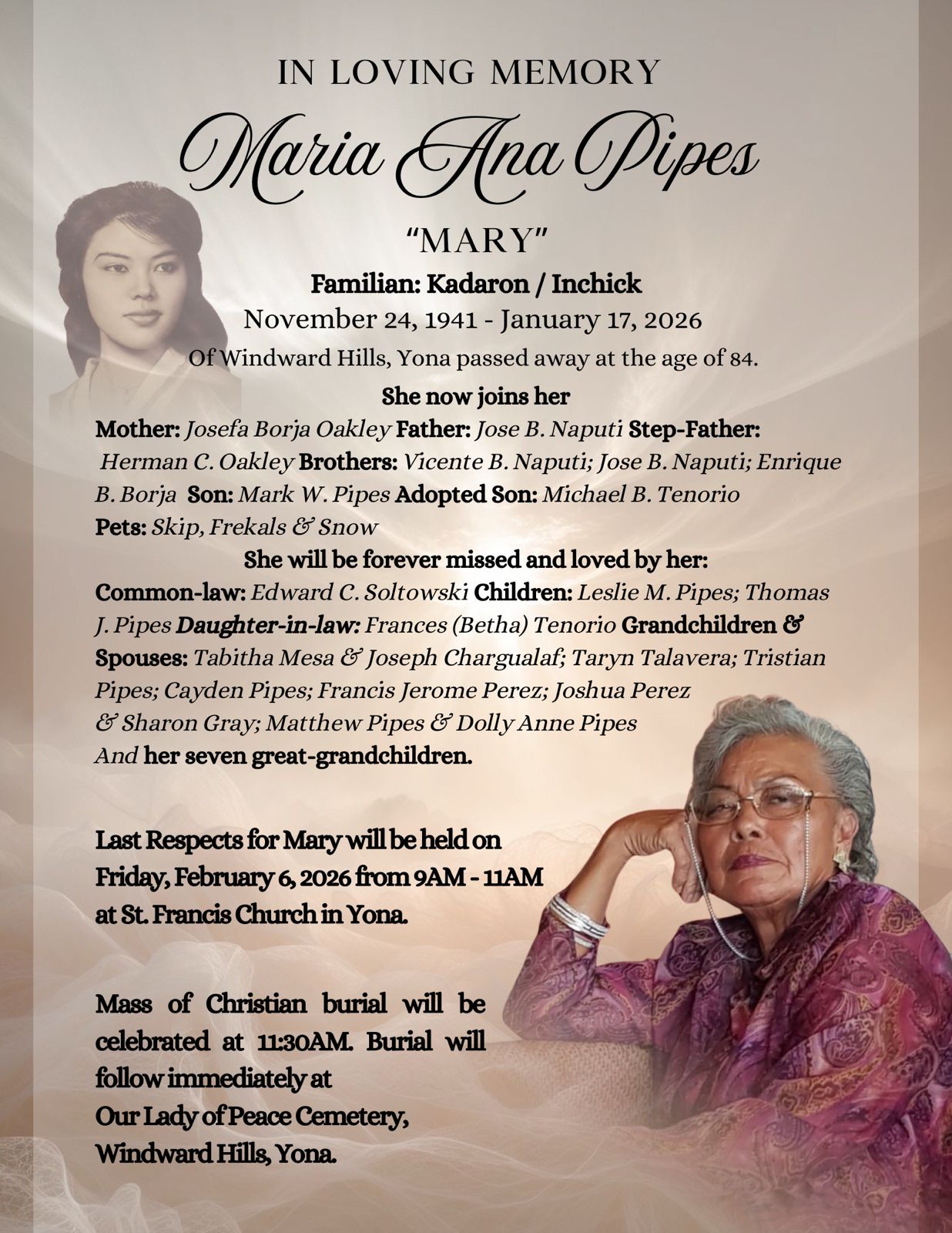 Maria Ana Pipes, of Windward Hills, Yona passed away on January 17, 2026, at the age of 84. Viewing and Last Respects may be paid on Friday, February 6, 2026, from 9:00am – 11:00am followed by Mass of Christian Burial at 11:30am at St. Francis Church, Yona. Interment Service will immediately follow at Our Lady of Peace Memorial Gardens, Windward Hills, Yona.