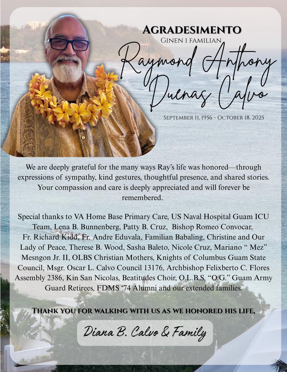 Raymond Anthony Duenas Calvo, familian “Pale & Lamban”, of Agana Heights was called to eternal life on October 18, 2025, at the age of 69. Viewing and Last Respects may be paid on Thursday, November 6, 2025, from 8:00am – 11:00am at the The Boys’ Chapel at Father Duenas in Mangilao. Mass of Christian Burial will be offered at 12:00pm at Our Lady of the Blessed Sacrament Church, Agana Heights. Interment Service will immediately follow at Our Lady of Peace Memorial Gardens, Windward Hills, Yona.